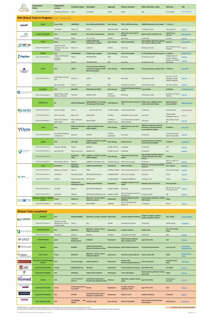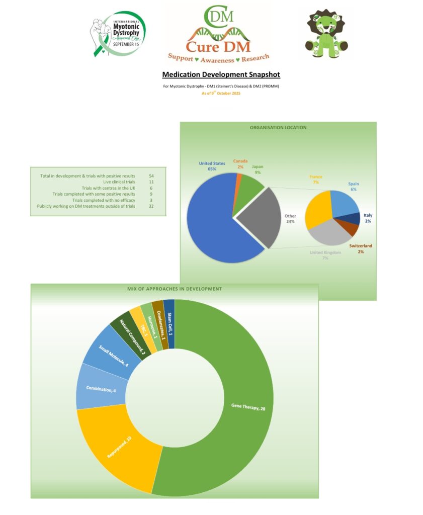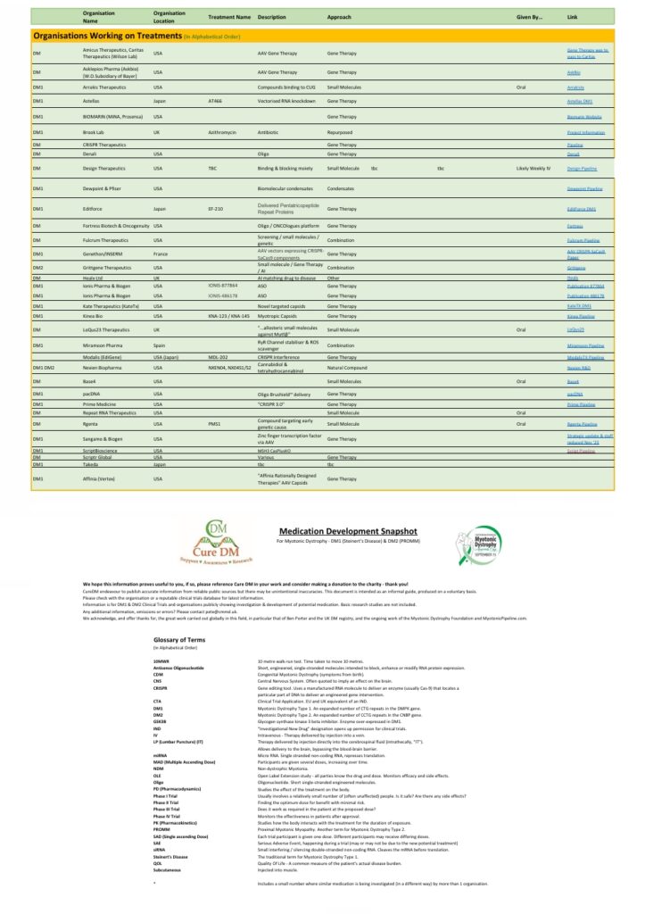 This snapshot includes all organisations that we have found to be publicly working on potential treatments for DM, together with details of their work and links to further information.
